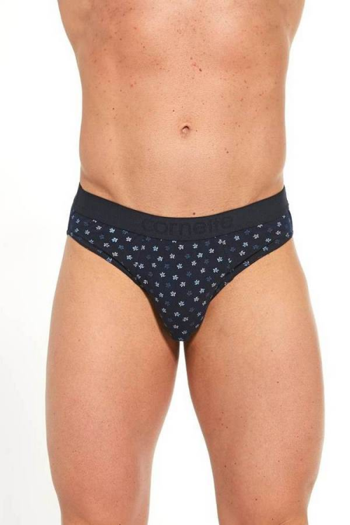 Slipy męskie z wysokiej jakości wzorzystej bawełny. Model dopasowany do ciała, w pasie szeroka, połyskująca guma z napisem Cornette. Pakowane w pudełko. Skład: 95% bawełna, 5% elastan.
