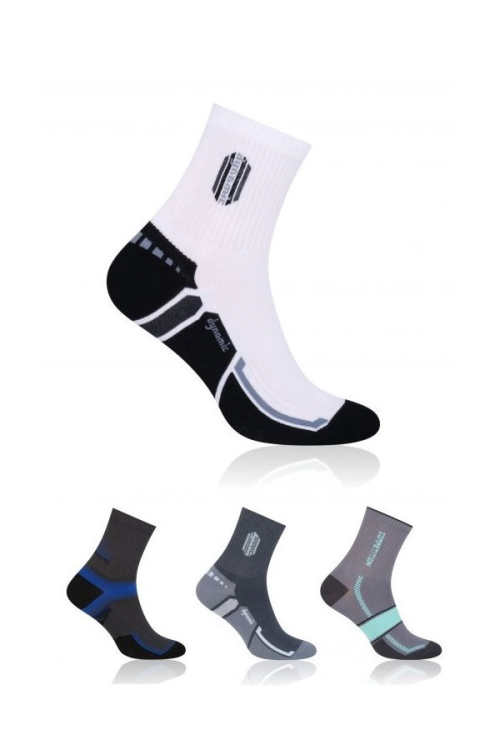 Bawełniane sportowe skarpety chłopięce z wysokim ściągaczem. Produkowane w wielu dynamicznych ciemnych i jasnych zestawieniach kolorystyczno-wzorniczych. Praktyczne i wygodne także do codziennego użytku.