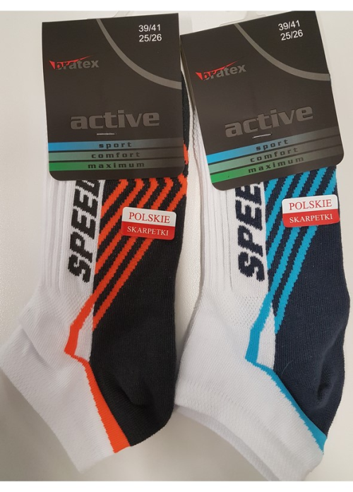 Męskie stopki sportowe z bawełny 76% i włókien elastycznych. Gwarantują maksimum komfortu w czasie uprawiania sportów. Wzorzyste.