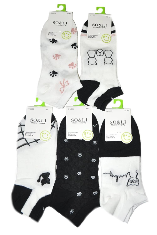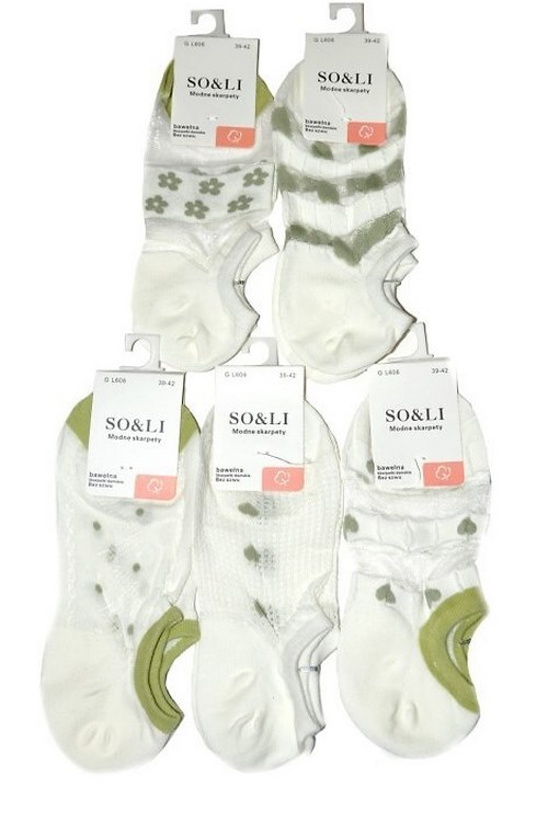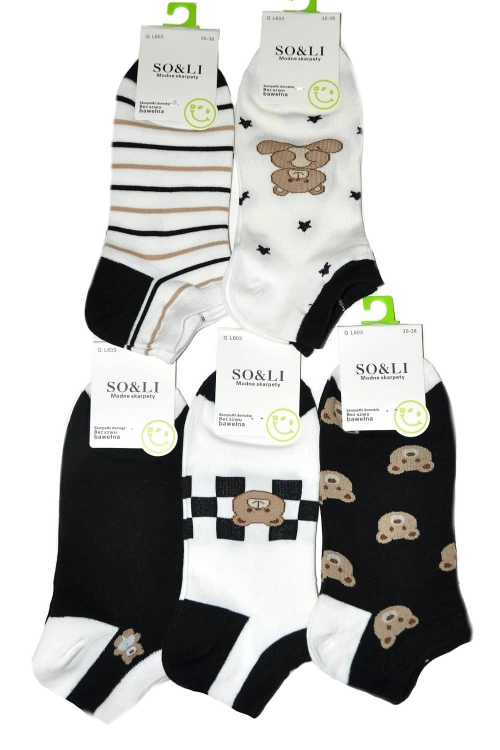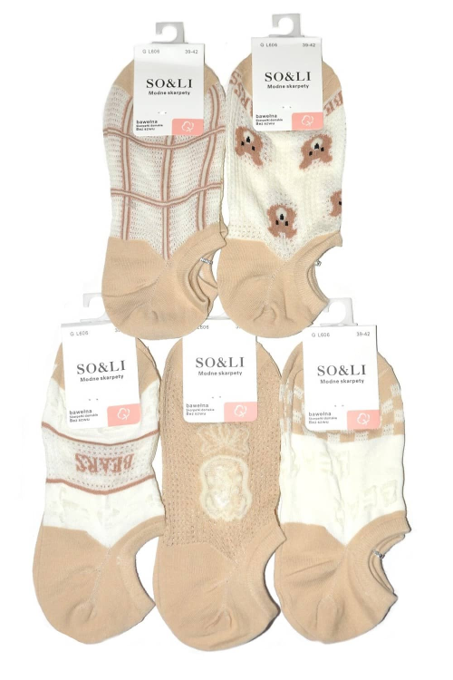 Stopki damskie z bawełny i dodatku włókien elastycznych ozdobione wytłoczonymi ażurowymi wzorami Skład: 85% bawełna, 10% poliester, 5% elastan.( Opakowanie jeden rozm. 5mix wzór .)