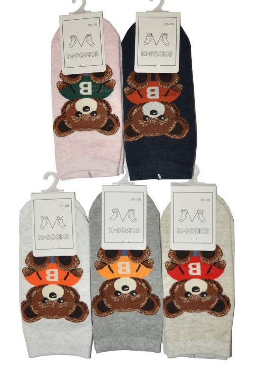 Bawełniane stopki damskie ozdobione kolorowym wzorem z misiem dostępne kolory: jeans, szary, różowy, beżowy, jasny szary . Skład: 95% bawełna, 5% spandex. Skład: 95% bawełna, 5% spandex.(pakownae jeden rozmiar 5 mix kolor).