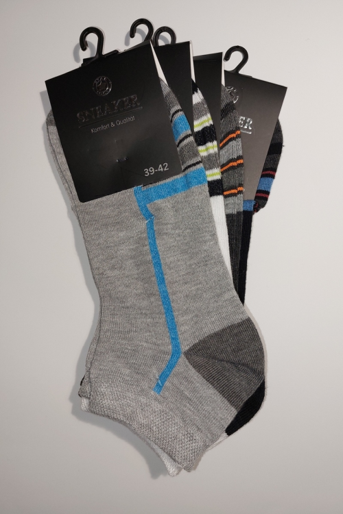 Stopki męskie pakowane po 4 pary mix wzór. Skład: 80% bawełna, 17% poliamid, 3% elastan.