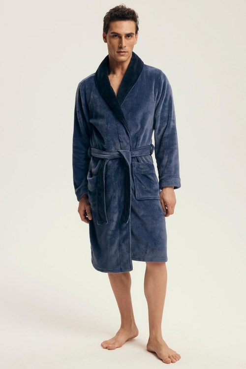 Klasyczny szlafrok męski , miękka, przyjemna dzianina , struktura materiału w prążek imitujący sztruks, szalowy kołnierz , wiązany w pasie , dwie kieszenie zewnętrzne , kontrastujące wykończenia, długość do kolan . Skład: 100% poliester.