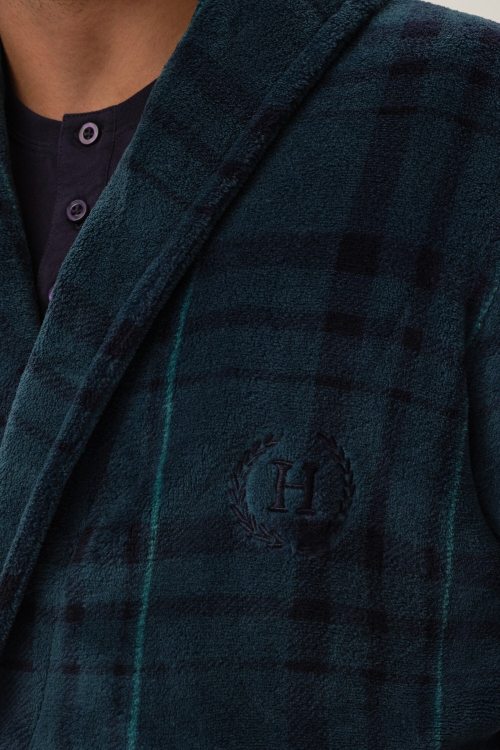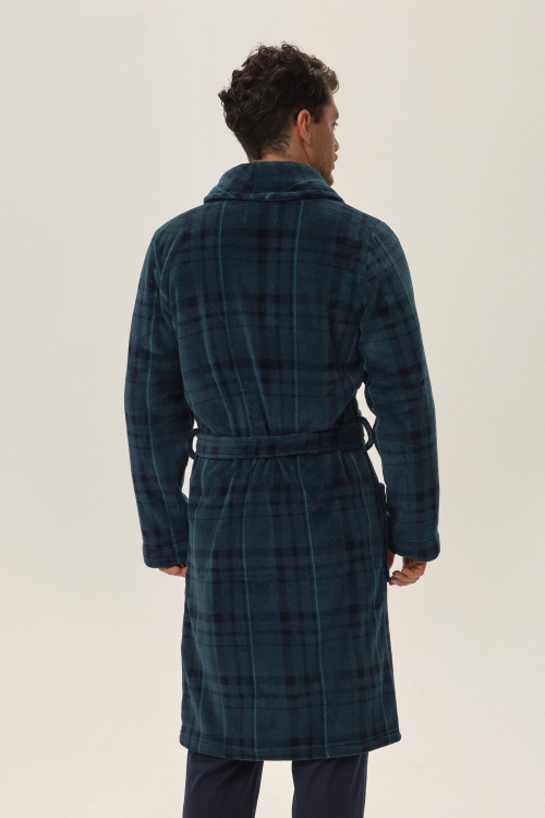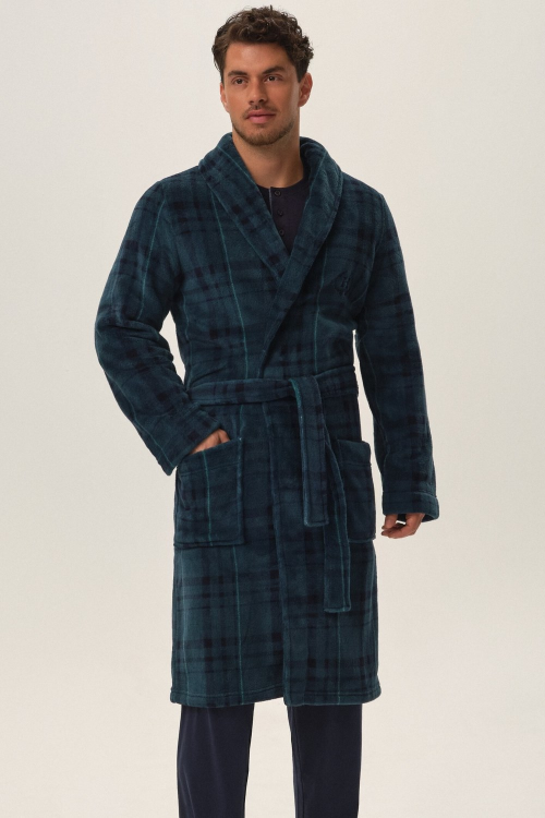 Klasyczny szlafrok męski kołnierz szalowy miękka, przyjemna dzianina, zdobiona nadrukiem w kratę delikatny haft na lewej piersi wiązany w pasie, dwie kieszenie zewnętrzne długość przed kolana. Skład: 100% poliester.