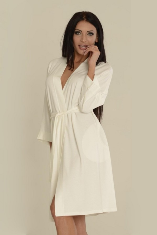 Szlafrok damski z wysokiej jakości wiskozy, od wewnętrznej strony faktura materiału "dresowego" krótki, wiązany w pasie z rękawem długość 3/4, tworzy idealny komplet z koszulką lub piżamą z kolekcji Visa . Skład: 94% wiskoza, 6% elastan.