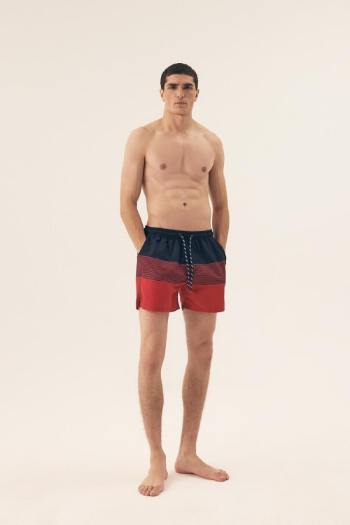 Szorty kąpielowe męskie , wykonane z szybkoschnącej tkaniny z kieszeniami od wewnętrznej strony wszyte slipy z siateczki w pasie gumka i sznurek do regulacji obwodu pasa na nogawce ozdobny nadruk. Skład: 100% poliester.
