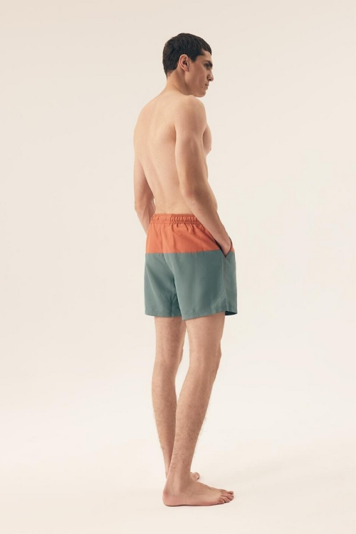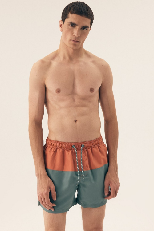Szorty kąpielowe męskie wykonane z szybkoschnącej dwukolorowej tkaniny w pasie gumka i wiązany troczek do regulacji obwodu pasa z kieszeniami na nogawce ozdobny nadruk od wewnętrznej strony wszyte slipy z siateczki. Skład: 100% poliester.