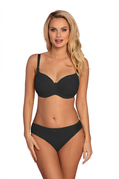 biustonosz o usztywnianych miskach. Szerokie, nieodpinane ramiączka doskonale podtrzymują biust. Miseczki zdobi subtelny haft. Skład: 75% poliamid, 15% elastan, 5% poliester, 5% bawełna.