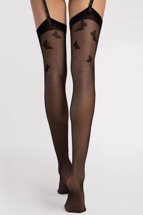 Pończochy do pasa delikatna, trwała, półmatowa dzianina grubość 20 den w górnej linii efektowny wzór motyli, niewidocznie wzmocnione, gładkie palce. Skład: 90% poliamid, 10% elastan.