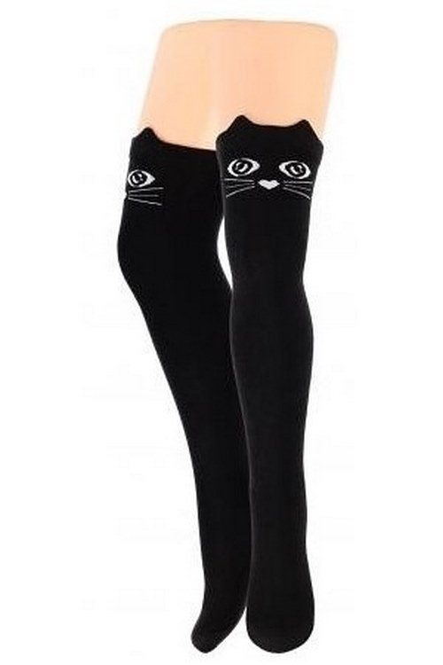Zakolanówki dziewczęce ozdobione zabawnym wzorem z kotkiem. Wygodny, szeroki, nieuciskający ściągacz. Skład:78% bawełna, 19% poliamid, 2% elastan, 1% polipropylen.